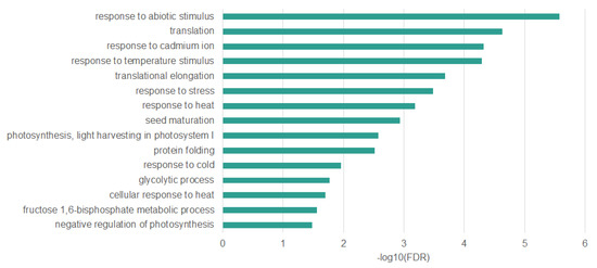 Many genes that we have identified as differentially methylated are associated with a response to stress (full list in Table S2). Especially interesting are those that have altered DNA methylation level in all sequence contexts, as they appear to be the most specifically related to the response to heat stress. We identified 45 genes with altered DNA methylation level in all sequence contexts. Ontology enrichment analysis of these genes (Figure 8) allowed to identify overrepresented biological processes such as response to heat (False Discovery Rate (FDR)—6.48 × 10−4; Fold Enrichment (FE)—15.85), protein folding (FDR—3.02 × 10−3; FE—16.49), translation (FDR—3.02 × 10−3; FE—11.71), and response to stress (FDR—3.30E-04; FE—3.47). All of these overrepresented terms are strictly associated with response to heat stress [7,31].