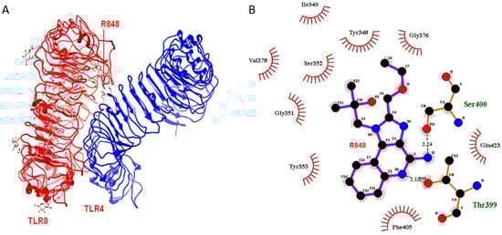 Molecular Docking: (A) Toll-like receptor (TLR)4-TLR8 heterodimer mediated by agonistic ligand R848 of TLR8. Both are wild types. (B) Ligand plot showing TLR4 variant (Threonin-399, i.e., 399C) interacting with agonistic ligand R848 and assisting in heterodimerisation.