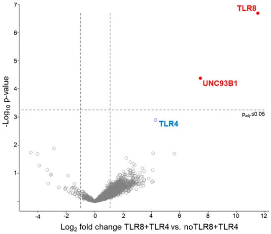 To further explore the potential interaction of TLR4 and TLR8, we conducted mass spectrometry analysis on co-immunoprecipitation (IP) to find evidence for heterodimer formation. With IP, we pulled down with anti-human influenza hemagglutinin (HA)-TLR8 in human embryonic kidney (HEK)293 cells that were either transfected with TLR4- and with or without TLR8-HA and analysed the samples for the presence of TLR4, TLR8 and other proteins. As expected, we saw a significant difference in TLR8 intensity between samples transfected with or without TLR8-HA. Furthermore, we identified protein unc-93 homolog B1 (UNC93B1) in the proteomic analysis as statistically significantly enriched when co-immunoprecipitating with TLR8-HA in HEK cells (Figure 2), as expected and reported by others []. The TLR4 receptor was identified in five out of six TLR8-HA+TLR4 co-transfected cell lysate immunoprecipitations, with two to five unique peptides, but not in any control sample. However, due to fluctuating LFQ intensities for TLR4, co-IP with TLR8-HA, and high variance in the whole dataset of the experiments, the enrichment of TLR4 in TLR8-HA co-transfected cells immunoprecipitated with anti-HA did not reach statistical significance after Benjamini–Hochberg correction (TLR4 log2 fold change = 4.27 and p > 0.05 after B.H. adjustment; before p = 0.001). The successful identification of a TLR4 peptide in TLR4/8 co-IP samples by higher-energy collisional dissociation spectrum is shown in Figure S1. Altogether, the data indicate that TLR8 can interact with TLR4 in HEK cells overexpressing both receptors.
