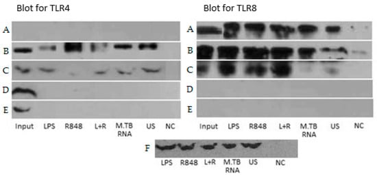 Co-immunoprecipitation. HEK 293 cells transfected as indicated per line, followed by stimulation as indicated per column (2 h for lipopolysaccharide (LPS) (10 ng/mL), R848 (2 µg/mL), LPS and R848 (L+R), 16 h for MTB RNA (1 µg/mL), unstimulated (US) and negative control (NC)). After 2 h, immunoprecipitation procedure was started. The left panel shows immunoprecipitation and -blot with anti-HA antibody (≈110 kDa), indirectly precipitating for TLR8. The right panel shows immunoprecipitation with anti-HA-antibody, followed by immunoblot with anti-TLR4 antibody (100 kDa). (A) hTLR8HA+UNC93B1, (B) hTLR8HA+UNC93B1+TLR4 399C-mCherry-myc, (C) hTLR8HA+UNC93B1+TLR4 399T-mCherry-myc, (D) TLR4 399C-mCherry-myc, (E) TLR4 399T-mCherry-myc, (F) hTLR8HA+UNC93B1 native cells blot with loading control—anti-GAPDH antibody (≈37 kDa). TLR8 was pulled down by anti-HA antibodies and identified in the immunoblot. When HEK cells were co-transfected with both TLR4 and TLR8, TLR4 could be identified in lysates precipitated for HA/TLR8, indicating heterodimerisation.