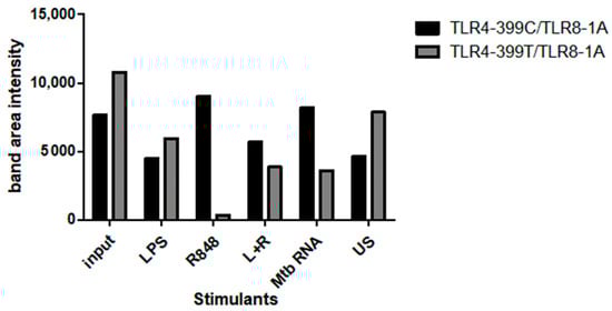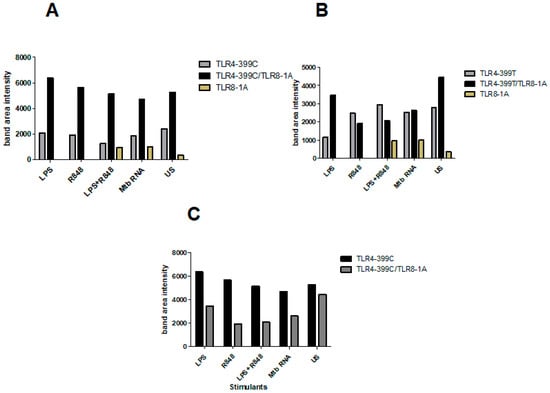 For further investigation of the potential interaction of TLR4 and TLR8, we performed co-IP experiments with TLR4 variants. HEK293XL/hTLR8-HA+UNC93B1 cells were transiently transfected with TLR4–mCherry–myc 399C or 399T followed by stimulation with LPS, R848, LPS+R848, and Mtb RNA, or left untreated for 2 h. First, the lysates were immunoprecipitated with anti-HA antibody to pull down TLR8 and then immunoblotted with either anti-TLR4 or anti-HA (for indirect blotting of TLR8) antibody (Figure 3). As expected, without transfection for TLR8, neither TLR4 nor TLR8 were identified in the precipitates. Interestingly, TLR4 was identified in all cells transfected with both TLR4 and TLR8, even in unstimulated cells. The successful blot of TLR4 after precipitation for TLR8 indicated an interaction of the two TLRs. Of note, adding MD2/CD14 to the transfection abolished this effect (Figure S2). In hTLR8HA+UNC93B1 cells co-transfected with TLR4-399C (the variant that we have identified to be able to interact with TLR8), R848 stimulation resulted in higher TLR4 band intensities as compared to other stimulants (Figure 3B). Adding LPS to R848 decreased TLR4-399C band intensity. Comparing the genotypes of TLR4 T399C by the quantification of band intensities, 399T-transfected cells exhibited less TLR4 band intensities upon stimulation with R848 and Mtb RNA, although both input and unstimulated cells showed higher band intensities for 399T than 399C (Figure 4).