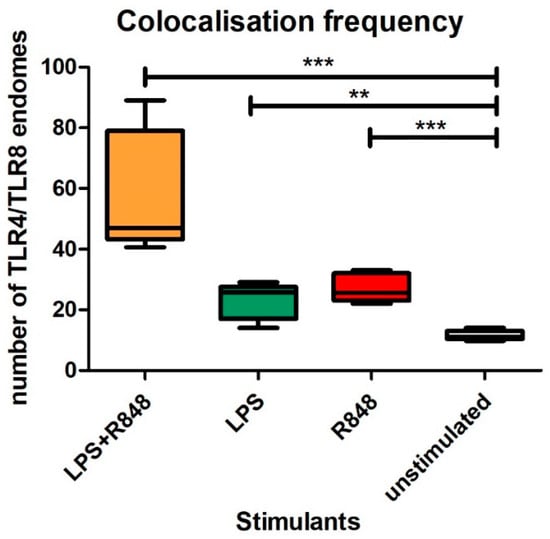 First, 1 × 105 HEK 293XL hTLR8-HA UNC93B1-mCitrine cells/well were seeded in imaging dishes (Ibidi), which was followed by transfection including accessory proteins gp96, PRAT4A, CD14, and MD2 for 48 h and stimulation with various ligands for 2 h. TLR8-HA was stained with anti-HA antibody (Sigma Aldrich, Munich, Germany) at a dilution of 1:200 in PBS containing 1% (w/v) bovine serum albumin (BSA) for 1 h at room temperature. Specimens were washed three times with PBS and incubated with anti-rabbit Alexa647 antibody diluted 1:2000 in PBS containing 1% (w/v) BSA for 30 min at room temperature. TLR4 plasmid has mCherry fluroprobe. Then, cells were imaged on a Leica SP5 AOBS with SMD confocal microscope, with a 63×, NA 1.20 water-immersion objective, at a lateral resolution of 120 nm. Cell Profiler and Fiji software were used to analyse the co-alocalisation, which was defined as a spatial overlap of fluorescent TLR4- and TLR8-labels indicated by yellow dots [].