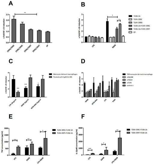 Functional studies within different cell lines to analyse the impact of the SNP TLR4-C399T on the interaction with TLR8. Used cells: (A,B): HEK293 blue null 1 cells, transiently transfected with TLRs or empty plasmid (EP) as indicated. (C,D): THP monocyte-derived macrophages. (E,F): Peripheral blood mononuclear cells (PBMCs) isolated from healthy homozygous volunteers that differed in their status of TLR4-399. Stimulation took place with LPS (100 ng/mL if not otherwise specified), R848 (2 µg/mL if not otherwise specified), Mtb-RNA (5 µg/mL) complexed with Lyovec or PAM3CSK4 as indicated for 16 h. NF-κB activation was measured by secreted embryonic alkaline phosphatase (SEAP) reporter gene assay, TNFα and IL12-p40 were measured by enzyme-linked immunosorbent assay (ELISA). (A) LPS responsiveness of different TLR4 SNPs: Transfection with variants human TLR4 along with human MD2. NF-κB fold induction was significantly raised in cells transfected with TLR4-299A-399C/MD2 compared to TLR4-299G-399C/MD2 (p < 0.01) and TLR4-299G-399T/MD2 (p < 0.007). (B) Co-transfection of TLR8 with TLR4-variants. Without accessory proteins, LPS stimulation was insignificant. TLR8 was stimulated successfully with R848. When adding TLR4-399C, NF-κB levels were significantly lower (p < 0.012). The difference between TLR8-1A+TLR3-399C and TLR8-1A-399T was also significant (p < 0.007). TLR8-1A and TLR8-1A+TLR4-399T did not show a significantly different response (p < 0.147). (C) Inhibition of TLR4 signalling with CLI-095. THP monocyte-derived macrophages were stimulated with or without 3 µM CLI-095 (LPS at 10 ng/mL). NF-κB response in the presence of TLR8 ligand R848 (p < 0.001), Mtb RNA (p < 0.01), and LPS (p < 0.001) decreased (D) TLR signalling adaptor protein inhibition with siRNA. THP monocyte-derived macrophages were with or without silencing MyD88, TRAM, or TLR4 (LPS at 10 ng/mL, R848 at 5 mg/mL). TLR8 ligand stimulation significantly decreased in presence of siMyD88 and siTRAM (p < 0.05). (E) TNFα and (F) IL-12p40-levels of PBMCs. Individuals with TLR4-399T showed more tumour necrosis factor (TNF)α upon stimulation with LPS (p < 0.001), R848 (p < 0.014), and LPS+R848 (p < 0.032) in comparison to individuals with TLR4-399C. Regarding IL-12p40, there were significantly higher concentrations in individuals with TLR4-399T with LPS (p < 0.001), R848 (p = 0.016), and LPS+R848 (p < 0.002) than 399C. * p ≤ 0.05, ** p ≤ 0.01, *** p ≤ 0.001.