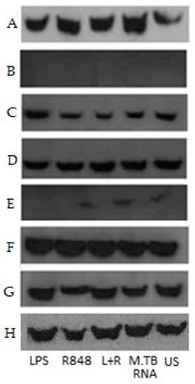 IRF3 Western blotting. (A) native HEK293 cells (B) HEK293 cells transfected with TLR4-399C/MD2 (C) HEK293 cells transfected with TLR4-399C (D) HEK293 cells transfected with TLR4-399T (E) HEK293 cells transfected with TLR8-1A (F) HEK293 cells transfected with TLR4-399C+TLR8-1A (G) HEK293 cells transfected with TLR4-399T +TLR8-1A were stimulated with LPS, R8484, LPS+R848 for 2 h and Mtb RNA (16h) or left untreated (US). (H) Native HEK293 cells blot with loading control–anti GAPDH antibody (≈37 kDa). IRF3 (≈55 kDa) could be identified in all double-transfected cell lysates.