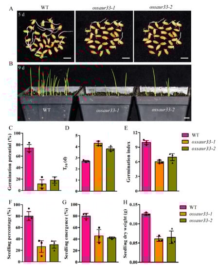 Comparison of seed vigor between the wild type (WT) and the ossaur33 mutants in rice. (A) Seed germination of the WT and ossaur33 mutants after 5 days. (B) Seedling establishment of the WT and ossaur33 mutants 9 days after direct seeding in soils. Bar = 10 mm. The seed vigor traits, including (C) germination potential, (D) T50, time to 50% germination, (E) germination index, and (F) seedling percentage, under normal conditions, and (G) seedling emergence, and (H) seedling dry weight after direct seeding. Each column represents the mean ± standard deviation, black small symbol means the value of each replication, n = 3.