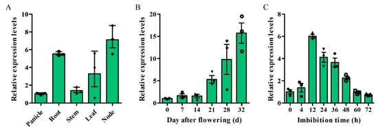 Expression patterns of OsSAUR33 by quantitative reverse transcription polymerase chain reaction (qRT-PCR) in rice. (A) Expression pattern of OsSAUR33 in various tissues, including panicle, root, stem, leaf, and internode, of rice. Expression pattern of OsSAUR33 in various developmental stages from 0 to 32 days after flowering (B) and during seed germination from 0 to 72 h of imbibition (C) in rice. The expression of OsSAUR33 was normalized to that of OsActin. Each column represents the mean ± standard deviation, black small symbol means the value of each replication, n = 3.