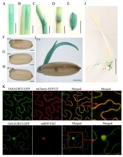 To further investigate the tissue-specific expression of OsSAUR33, we performed histochemical staining for β-glucuronidase (GUS) activity of the OsSAUR33 promoter:GUS transgenic lines in rice. GUS was strongly expressed in leaf, stem, internode, root, and panicle tissues, as well as in the germinating embryos and shoots (Figure 3A–J). This finding is consistent with the above qRT-PCR results. To determine the subcellular localization of OsSAUR33, we constructed a recombinant OsSAUR33 protein tagged at the C terminus with green fluorescent protein (GFP) under the control of the 35S promoter and expressed it transiently in Nicotiana benthamiana leaves. Confocal microscopy revealed that OsSAUR33-GFP signals co-localized with the red fluorescence signal of mCherry-SYP122, a plasma membrane (PM) marker, and of mRFP-Fib2, a nucleus marker, respectively, indicating that OsSAUR33 was likely localized in the plasma membrane and nucleus (Figure 3K).