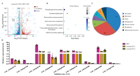 Rice OsSAUR33 alters the mobilization of stored reserves during seed germination. (A) The differentially expressed genes (DEGs) with p < 0.001 and fold change ≥ 2 between the WT and the ossaur33-1 mutant in the early (12 h) germinating seeds. Red, up-regulation; Gray, no change; Blue, down-regulation. (B) Kyoto Encyclopedia of Genes and Genomes (KEGG) analysis of the DEGs. (C) DEGs involved in starch and sucrose metabolism. (D) The expression confirmation of starch and sucrose metabolism-related DEGs in the early (12 h) germinating seeds using qRT-PCR. The expression of genes was normalized to that of OsActin. Each column represents the mean ± standard deviation, black small symbol means the value of each replication, n = 3.
