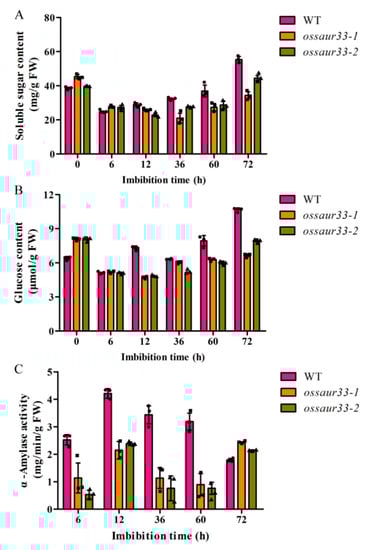 Our RNA-seq data suggested that the mechanism of OsSAUR33-mediated regulation of seed vigor might involve the sugar levels in seeds. Thus, the sugar contents in the mature grains and germinating seeds were compared between the ossaur33 mutants and the WT. The total soluble sugar and glucose contents were higher in the ossaur33 mutant seeds compared to those of the WT at 0 h (dry mature seed) and 6 h of imbibition, while the contents were lower at 12, 36, 60, and 72 h of imbibition (Figure 5A,B). Additionally, the lower α-amylase activities were observed in the ossaur33 mutants at 6 to 60 h of imbibition but higher activities were observed at 72 h of imbibition compared with the WT (Figure 5C). These results suggest that OsSAUR33 regulates starch mobilization by modulating α-amylase hydrolase activity during seed germination in rice.