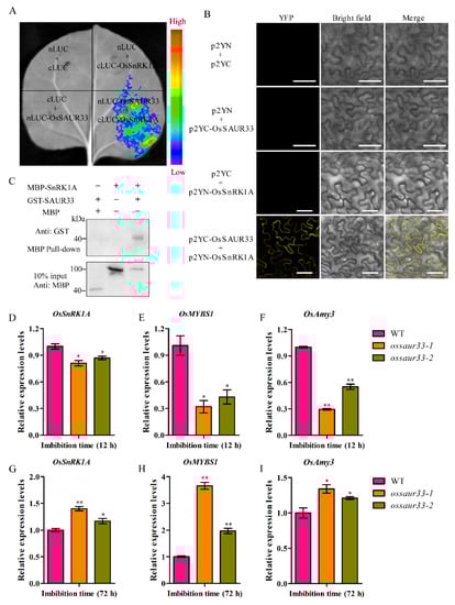 OsSAUR33 interacts with OsSnRK1A and alters the expression of OsSnRK1A, OsMYBS1, and OsAmy3 during seed germination in rice. (A) Firefly luciferase (LUC) complementation imaging assay. nLUC-OsSnRK1A and cLUC-OsSAUR33 with the control vector were co-infiltrated into N. benthamiana leaves. LUC images were captured using a cooled Charge-coupled Device (CCD) imaging apparatus. (B) Bimolecular fluorescence complementation (BiFC) assay. OsSAUR33 and OsSnRK1A were fused to p2YC and p2YN, respectively. Different pairs of constructs were co-expressed in N. benthamiana. Yellow fluorescent protein (YFP) fluorescence was detected by confocal microscopy. Bar = 50 μm. (C) Maltose Binding Protein (MPB) pull-down assay of the OsSAUR33 and OsSnRK1A interaction. Anti-GST antibody was used to detect the output protein. The expression of OsSnRK1A (D,G), OsMYBS1 (E,H), and OsAmy3 (F,I) in the WT and the ossaur33 mutants at 12 h and 72 h of imbibition. The expression of genes was normalized to that of OsActin. Each column represents the mean ± standard deviation, black small symbol means the value of each replication, n = 3.