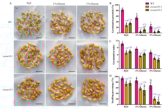The evaluation of seed vigor was conducted according to He et al. [12] under normal and direct seeding conditions. Thirty seeds per replicate of the ossaur33 mutants and WT Nipponbare were germinated in 9 cm-diameter Petri dishes under normal conditions at 25 ± 1 °C for 9 days. Meanwhile, 30 seeds per replicate were sown in 1 cm-deep soils at 25–30 °C for 9 days. Additionally, the influence of glucose (3% and 6%) treatments on seed vigor was also tested. The criteria for seed germination and seedling establishment were as stated in He et al. [3]. Seed vigor, including germination potential, germination index, germination percentage, time to reach 50% germination, and seedling percentage, were calculated. Three biological replications were performed.