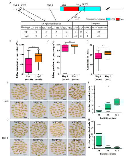 To investigate whether the variation in different OsSAUR33 alleles is associated with differences in seed vigor, we analyzed the single-nucleotide polymorphisms (SNPs) in the region from ~2 kb upstream of OsSAUR33 and its coding region using the SNP data of 180 rice accessions (Table S4) [37]. Two haplotypes of OsSAUR33 were identified among these accessions (Figure 8A). The elite haplotype, Hap 2, associated with high seed vigor and mainly existed in indica accessions; by contrast, Hap 1 associated with low seed vigor, mainly existed in japonica accessions (Figure 8B–D). Several elite indica accessions harboring Hap 2 were identified with high seed vigor (germination percentage after 2 days of greater than 75%), and several japonica accessions harboring Hap 1 were identified with low seed vigor (germination percentage after 2 days of less than 15%) (Figure 8E,G, Table S5). The expression of OsSAUR33 in the accessions was analyzed during seed germination (0 to 12 h of imbibition). Interestingly, early induction of OsSAUR33 expression was observed in accessions harboring Hap 2 (high seed vigor) but not in accessions harboring Hap 1 (low seed vigor) during seed germination (Figure 8F,H).