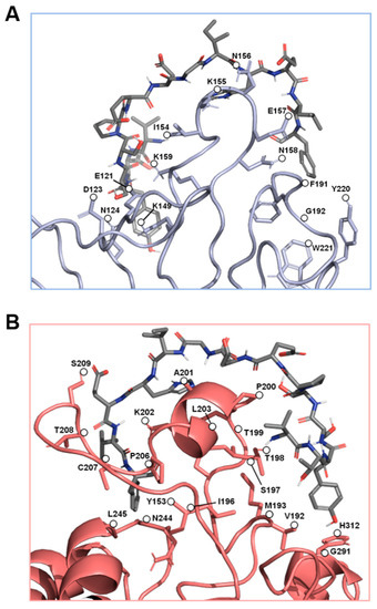 The predicted key binding amino acids of the triple loop structures from the α4 and β1 subunits. The amino acids with the highest predicted binding affinities to the EDA-FN peptide (grey) are highlighted within (A) the α4 subunit triple loop finger-like domains of the integrin receptor cleft (blue), and (B) the β1 subunit triple loop finger-like domains of the integrin receptor cleft (red). The β1 subunit was used for visualization.
