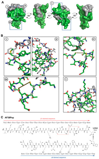 Molecular docking analysis of the designed blocking polypeptide and key features. (A) The EDA-FN peptide (grey) was docked to the blocking polypeptide (green) derived from the polypeptide with the overall highest scores across all refinement analyses. A 360° rotation is shown to visualize the wrapping and binding of the EDA-FN peptide to the blocking polypeptide, which mimics the integrin α4β1/β7 receptor binding site. Boxed regions I–IV are shown in (B) to highlight the key features of the designed blocking polypeptide. I, the VM cap; II, the ISTTPAK motif of the β1/β7 subunit; III and IV, the C=C disulfide bridge to form the receptor and cage-like conformation; V, the KNENKI motif of the α4 subunit. (C) The antifibrotic 38-amino-acid polypeptide (AF38Pep) polypeptide sequence structure, showing two peptide chains derived from integrins β1 and α4, linked by a serine. Disulfide bridge is shown by a red dashed line, bridging the two cysteines.