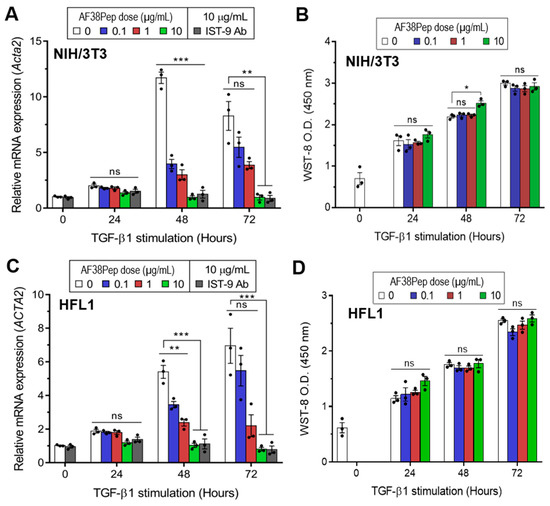 To determine whether the blocking polypeptide had antifibrotic functionality or exhibited cytotoxicity, we incubated TGF-β1-treated mouse dermal fibroblasts (NIH/3T3; Figure 5A,B) or human lung fibroblasts (HFL1; Figure 5C,D) with a log10 dilution range of AF38Pep. Over the course of 72 h, TGF-β1 induced the largest mRNA expression of the myofibroblast marker, α-SMA, at the 48 h timepoint in NIH/3T3 cells (Figure 5A). Treatment with the blocking peptide significantly attenuated gene induction at 48 h in all concentrations tested. At the 72 h timepoint, α-SMA mRNA expression was elevated in the untreated control group. However, only AF38Pep treatment at a concentration of 10 µg/mL was sufficient to significantly attenuate the α-SMA mRNA upregulation, which suggested that 0.1–1 µg/mL polypeptide concentrations were not able to effectively inhibit the differentiation response over the 72 h duration of treatment. Cytotoxicity of AF38Pep was assessed to ensure the effects observed were not indicative of NIH/3T3 cell apoptosis (Figure 5B). Indeed, cells maintained a consistent growth pattern in response to TGF-β1 stimulation, and results suggest that treatment with the polypeptide at either of the concentrations did not interfere with cell proliferation nor incur cell death. Similar results were observed when HFL1 cells were assessed for the potential of the blocking polypeptide to attenuate expression of α-SMA (Figure 5C). The upregulation of α-SMA mRNA expression by TGF-β1 was significantly reduced by 0.1–10 µg/mL peptide at 48 h, and only 10 µg/mL was sufficient for inhibition of expression at 72 h. Assessment of AF38Pep toxicity to HFL1 cells (Figure 5D) indicated that the blocking effect was not detrimental to cell numbers.