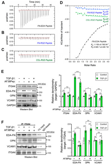 Binding specificity and blocking function of the synthesized blocking polypeptide. The designed blocking peptide was synthesized alongside 3 small test-binding peptides (FN-EDA, FN-RGD, COL-RGD) and were assessed by isothermal calorimetry (ITC), and calorimetric heat traces were used to test whether the blocking peptide has specificity to bind peptides derived from (A) the predicted EDA binding ligand (FN-EDA, black), (B) the RGD-domain of EDA-FN and FN shown to bind integrin α4β1/β7 at a distal site (FN-RGD, blue), and (C) the RGD-domain of collagen I previously shown to bind different integrin subunits (COL-RGD, negative control, green). (D) The collated isogram is shown alongside predicted dissociation constants (KD) and association constants (KA), calculated using a 1:1 receptor site to ligand site binding mode. (E) Western blot analysis of integrin α4 protein (ITGA4), EDA-FN, osteopontin (OPN), and vascular cell adhesion protein-1 (VCAM1) total protein following 48 h TGF-β1, AF38Pep or TGF-β1+AF38Pep treatments. GAPDH was used as a loading control. Densitometry quantification is shown alongside. (F) Co-IP analysis of ITGA4 binding partners (EDA-FN, OPN, and VCAM1) following 48 h TGF-β1, AF38Pep or TGF-β1+AF38Pep treatments. Data are representative of three independent experiments and displayed as the mean ± S.E. Statistical analysis is shown as *** p ≤ 0.001, * p ≤ 0.05, and ns = no statistical significance (p > 0.05).