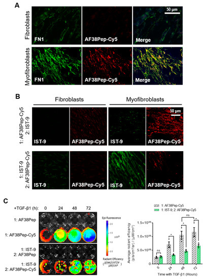To determine AF38Pep affinity for myofibroblast-synthesized ECM, AF38Pep was conjugated to Cy5 dye (AF38Pep-Cy5) and incubated with fixed ECM synthesized by either untreated control fibroblasts or differentiated myofibroblasts. First, localization was assessed by comparing AF38Pep-Cy5 labelling to pan-fibronectin (FN1) immunostaining (Figure 7A). In fibroblasts, some FN1 staining was observable, whereas little to no staining with AF38Pep-Cy5 was observed. In myofibroblasts, FN1 deposition increased and was clearly visualized. AF38Pep-Cy5 labelling also increased in myofibroblasts (red) and merged images showed AF38Pep-Cy5 colocalization with anti-FN1 staining (yellow) was prominent in areas of fibronectin deposition at cell membranes, although regions that were only labelled by FN1 immunostaining were also observed (green). We next compared staining patterns compared to IST-9 (EDA-FN antibody), and whether pretreatments would competitively interfere with labelling (Figure 7B). In fibroblasts, staining with either IST-9 or AF38Pep-Cy5 was minimal, regardless of the order of addition to cells. In myofibroblasts, AF38Pep-Cy5 labelled the upregulated EDA-FN production and pre-treatment blocked IST-9 staining. Similarly, when IST-9 pretreatments were applied, AF38Pep-Cy5 failed to label the elevated EDA-FN production. We further confirmed EDA-FN ECM specificity and competitive binding by incubating AF38Pep-Cy5 with cells treated with TGF-β1 for 24 (early activated fibroblasts), 48 (late activated fibroblasts) and 72 h (differentiated myofibroblasts). The results demonstrated increased binding of AF38Pep to the fibrotic ECM, which correlated with the increasing time of TGF-β1 treatment (Figure 7C). The data showed significant increases in binding at 48 h, compared to 0 h TGF-β1 treatment. Similar results to the immunocytochemistry were observed when pretreatments with IST-9 were made; IST-9 attenuated AF38Pep-Cy5 binding to EDA-FN protein, thereby decreasing the detectable epifluorescence signal over the course of the 72 h TGF-β1 treatment. Taken together, these data suggested that binding sites for AF38Pep-Cy5 were masked by IST-9 pretreatments. AF38Pep also had the capacity to interfere with IST-9 binding, indicating binding specificity of AF38Pep for the EDA-FN protein.