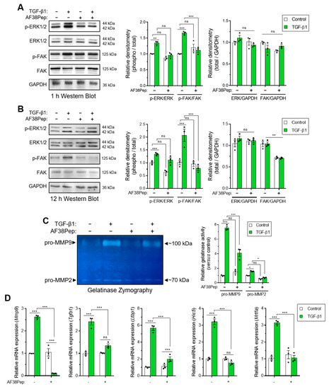 Evaluation of blocking peptide capacity to inhibit integrin α4β1 signaling and downstream profibrotic effects. NIH/3T3 fibroblasts were incubated in the presence or absence of 10 ng/mL TGF-β1 with or without 10 µg/mL AF38Pep for (A) 1 h or (B) 12 h, before assessment of extracellular-signal-regulated kinases 1 and 2 (ERK1/2) and focal adhesion kinase (FAK) protein expression and phosphorylation. Immunoblots are displayed alongside corresponding densitometry analysis of phospho-protein/total-protein and total-protein/GAPDH loading control. (C) Gelatinase zymography indicating pro-matrix metalloproteinase 9 (pro-MMP9) (top band) and pro-MMP2 (bottom band) enzymatic activity following the indicated treatments for 48 h. Shown alongside is the quantification of relative gelatinase activity. (D) The mRNA expression for genes associated with integrin α4β1 activation: Mmp9, Tgfb1, Ltbp1, Hic5, and Mrtfa, which were assessed by real-time quantitative PCR (qRT-PCR) following 48 h of stimulation by 10 ng/mL TGF-β1. Blots, images, and data are representative of three independent experiments and data are shown as the mean ± S.E. Statistical analysis is shown as *** p ≤ 0.001, ** p ≤ 0.01, * p ≤ 0.05, and ns = no statistical significance (p > 0.05).