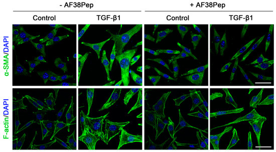 Assessment of blocking peptide effect on myofibroblast phenotype acquisition. NIH/3T3 fibroblasts were incubated in the presence or absence of 10 ng/mL TGF-β1 with or without 10 µg/mL of peptide for 48 h; immunocytochemistry was used to visualize the marker of myofibroblast differentiation (α-SMA, green; DAPI, blue; top row; original magnification, x200; scale bar, 25 µm) and an indicator of fibroblast activation to a proliferative, migratory and synthetic phenotype (F-actin, green; DAPI, blue; bottom row; original magnification, x200; scale bar, 25 µm). Images are representative of three independent experiments.