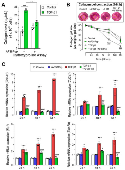 Approximately 2 × 104/mL NIH/3T3 fibroblasts were added to a solution containing 3 mg/mL rat tail collagen type I (BD Biosciences, San Diego, CA, USA), 260 mM NaHCO3, 200 mM HEPES and 50 mM NaOH. To each well of a 24-well cell culture plate, 500 µL of collagen-cell solution was added and allowed to polymerize at 37 °C for 1 h. The gels were carefully detached from the well walls before resuspension of gels in 1% FBS-DMEM and maintained at 37 °C, in a 5% CO2 atmosphere for 24 h. The DMEM medium was removed and replaced with serum-free DMEM medium with or without 10 ng/mL TGF-β1 and/or 10 µg/mL AF38Pep. Gels were photographed and measured at days 0, 1, 2, 4, and 6 after treatment. The average contraction values were obtained using ImageJ v1.37c (NIH, Bethesda, MD, USA) and are expressed as a percentage of contraction versus the initial gel diameter at 0 days.