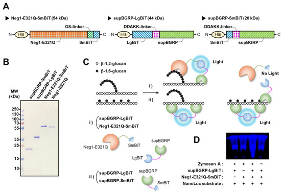 Split-NanoLuc complementation assay for β-glucan. (A) Diagram of Neg1-E321Q-SmBiT, supBGRP-LgBiT, and supBGRP-SmBiT. (B) SDS-PAGE image of supBGRP-SmBiT, supBGRP-LgBiT, Neg1-E321Q-SmBiT, and Neg1-E321Q. Purified recombinant proteins were separated using a 12% polyacrylamide gel under nonreducing conditions and identified by Coomassie Brilliant Blue staining. (C) Schematic illustration of the split-NanoLuc complementation assay for β-glucan. (D) Validation of sensor for β-1,6-branched β-1,3-d-glucan by bioluminescence imaging. Zymosan A (50 μg/mL, 40 μL) was mixed with split-NanoLuc-fusion proteins (800 nM each, 10 μL) and furimazine solution (60 μL) in microtubes.