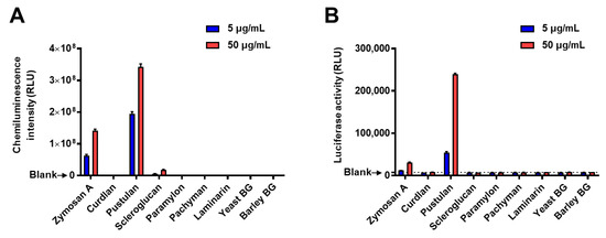 Laminarin (soluble β-1,3-glucan polymer) from Laminaria digitate, β-d-glucan from barley (barley BG), zymosan A and mannan (α-1,6-/α-1,2-, α-1,3-mannan) from S. cerevisiae, and bovine serum albumin (BSA) were purchased from Sigma-Aldrich (St. Louis, MO, USA). Dulbecco’s PBS, curdlan, paramylon, chitin, and dextran were obtained from Wako Pure Chemical Industries, Ltd. (Osaka, Japan). Pustulan (soluble β-1,6-glucan polymer) from Lasallia pustulata and hot alkaline-treated zymosan (depleted zymosan) were purchased from InvivoGen (San Diego, CA, USA). Scleroglucan was purchased from CarboMer, Inc. (San Diego, CA, USA). Pachyman was procured from Calbiochem (San Diego, CA, USA), and yeast β-1,3-/β-1,6-glucan (yeast BG) and corn core xylan were obtained from Megazyme (Bray, Ireland) and Tokyo Chemical Industry Co., Ltd. (Tokyo, Japan), respectively. Streptavidin-conjugated HRP was provided by R&D Systems (Minneapolis, MN, USA), and Coomassie Brilliant Blue (Rapid CBB KANTO, CBB-R250) by Kanto Kagaku Co. (Tokyo, Japan). The endo-β-1,3-glucanase (zymolyase 100T) was purchased from Seikagaku Corp. (Tokyo, Japan). Outdoor-cultivated fruiting bodies of Agaricus brasiliensis strain KA21 were provided by Toei Shinyaku Co., Ltd. (Tokyo, Japan). C. albicans NBRC 1385 and N. crassa NBRC 6068 were obtained from the NITE Biological Resource Center (Chiba, Japan). The polysaccharide samples used in this study are listed in Table 1. The elemental composition of several polysaccharide products was confirmed by elemental analysis using an Elementar Vario EL Cube analyzer (Elementar Analysensysteme GmbH, Langenselbold, Germany).