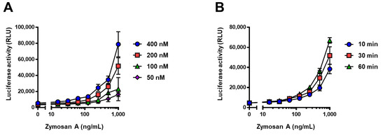 Effect of different concentrations and incubation time periods on split-NanoLuc complementation assay. (A) Different concentrations of mixture of supBGRP-LgBiT and Neg1-E321Q-SmBiT (5 μL) were incubated with 10 μL of zymosan A (0–1000 ng/mL) for 30 min. (B) Zymosan A (0–1000 ng/mL, 10 μL) was incubated with the mixture solution of supBGRP-LgBiT and Neg1-E321Q-SmBiT (200 nM each, 5 μL) for different time points (10, 30, and 60 min). After incubation, 15 μL of furimazine solution were added and NanoLuc activity was measured. Data are presented as the mean ± SD of values in four experiments.