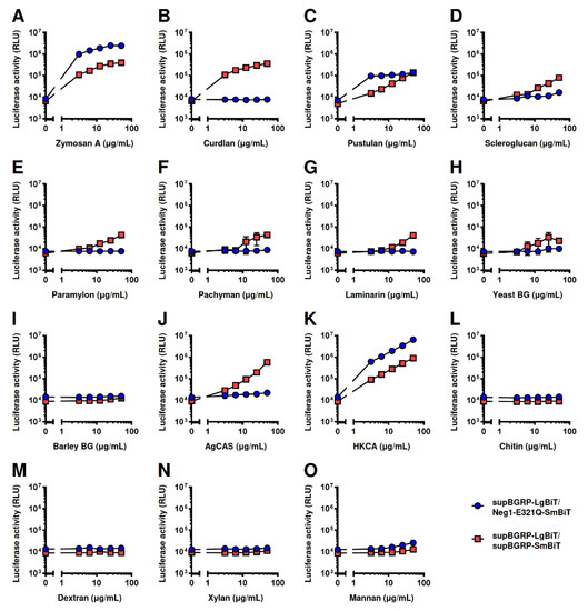 Next, we evaluated the reactivity of the split-NanoLuc complementation assay with various polysaccharides (Table 1). The combination of supBGRP-LgBiT and supBGRP-SmBiT showed strong reactivity to zymosan A, curdlan, and pustulan (Figure 4A–C) and weak reactivity to scleroglucan, paramylon, pachyman, laminarin, and yeast BG (Figure 4D–H). However, this combination failed to respond to barley BG, a β-1,4-/β-1,3-glucan (Figure 4I). In addition, the β-1,3-glucan structure showed reactivity to crude samples, including mushroom-derived AgCAS and heat-killed Candida albicans (HKCA) (Figure 4J,K). Other polysaccharides such as chitin, dextran, xylan, and mannan without β-1,3-glucan structure (Figure 4L–O) showed no reactivity. In contrast, the combination of supBGRP-LgBiT and Neg1-E321Q-SmBiT exhibited a strong response to long β-1,6-branched-β-1,3-glucans such as zymosan A, pustulan, and HKCA (Figure 4A,C,K) and weak reactivity toward scleroglucan and yeast BG (Figure 4D,H). These results demonstrate that the split-NanoLuc complementation assay constructed herein can be applied for the detection of β-1,3-glucan or long β-1,6-branched-β-1,3-glucan.