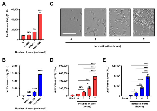 Reconstitution of NanoLuc on the cell surface of live C. albicans. (A,B) Reactivity to yeast form C. albicans. Yeasts in 96-well white V-bottom plate (0, 104, 105 or 106 cells/well) were washed, treated with the mixture solution of (A) supBGRP-LgBiT and supBGRP-SmBiT or (B) supBGRP-LgBiT and Neg1-E321Q-SmBiT, and the NanoLuc activity measured. (C) Images showing the proliferation of C. albicans (105 cells/well) in a 96-well clear flat bottom plate. (D,E) Reactivity to hypha form C. albicans. Yeasts in 96-well white V-bottom plate (105 cells/well) were cultured for different time periods (0, 2, 4 or 7 h) at 37 °C. The hyphae were washed and analyzed with (D) supBGRP-LgBiT and supBGRP-SmBiT or (E) supBGRP-LgBiT and Neg1-E321Q-SmBiT. Data are presented as the mean ± SD (n = 3 for A, B, n = 4 for D, E) and are representative results from at least two independent experiments. Significant differences from blank (Tukey’s test for A, B) or between different incubation time (Dunnett’s test for D, E): * p < 0.05, *** p < 0.001, **** p < 0.0001, NS: not significant. Scale bar: 50 μm.