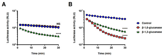 Real-time monitoring of side-chain structural changes of β-glucan using split-NanoLuc complementation assay. The mixture solution of (A) supBGRP-LgBiT and supBGRP-SmBiT or (B) supBGRP-LgBiT and Neg1-E321Q-SmBiT (200 nM each, 5 μL) were incubated with 10 μL of zymosan A (10 μg/mL) for 60 min. After incubation, endo-β-1,6-glucanase or endo-β-1,3-glucanase (0.5 μg/mL, final) was added with 15 μL of furimazine solution, and reconstituted NanoLuc activity was measured 15 times every 2 min. Data are presented as the mean ± SD (n = 4) and are representative results from at least two independent experiments. Significant differences relative to untreated (control) sample at 30 min (unpaired t-test) are represented as **** p < 0.0001; NS: not significant.