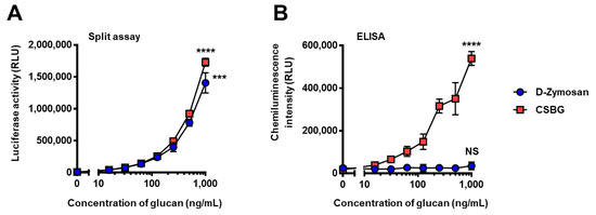 Comparison of split-NanoLuc assay and ELISA for detecting soluble and insoluble β-glucans. (A) Response to the split-NanoLuc complementation assay. The mixture solution of supBGRP-LgBiT and Neg1-E321Q-SmBiT (200 nM each, 5 μL) was incubated with 10 μL of depleted zymosan (D-Zymosan) suspension or CSBG solution (0–1000 ng/mL, each). After 30 min, 15 μL of furimazine solution were added and NanoLuc activity measured. (B) Response to the HRP-based ELISA method. D-Zymosan suspension and CSBG solution (0–1000 ng/mL) bound to a plate coated with supBGRP-LgBiT were detected using Neg1-E321Q-biotin and streptavidin-HRP with a chemiluminescence substrate. Data are presented as the mean ± SD (n = 4) and are representative results from at least two independent experiments. Significant differences between blank and the highest concentration (1000 ng/mL) are indicated as *** p < 0.001; **** p < 0.0001; NS: not significant.
