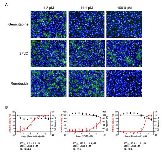Chicago/Turabian StyleJang, Yejin, Jin Soo Shin, Myoung Kyu Lee, Eunhye Jung, Timothy An, Uk-Il Kim, Kyungjin Kim, and Meehyein Kim. 2021. "Comparison of Antiviral Activity of Gemcitabine with 2′-Fluoro-2′-Deoxycytidine and Combination Therapy with Remdesivir against SARS-CoV-2" International Journal of Molecular Sciences 22, no. 4: 1581. https://doi.org/10.3390/ijms22041581