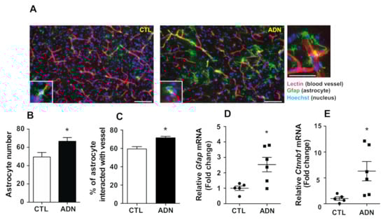 Central administration of adiponectin leads to activation of hypothalamic astrocytes. The whole brain was collected from mice that received an intracerebroventricular (icv) injection of adiponectin (ADN, 3 μg/2 μL) and intracardiac injection of lectin. The distribution of astrocytes was examined by immunohistochemistry using an antibody against glial fibrillary acidic protein (Gfap), a molecular marker for astrocytes. (A) Representative images of Gfap immunolabeling in the hypothalamus. Icv administration of adiponectin led to increased (B) number of astrocytes and (C) contact ratio between astrocytes and blood vessels in the hypothalamus of the mouse brain (n = 5 for each group). Icv administration of adiponectin elevated mRNA levels of (D) Gfap and (E) Ctnnb1 as determined by qRT-PCR (n = 5 for CTL; n = 6 for ADN). Results are presented as mean ± SEM. * p < 0.05. Scale bar = 50 μm.