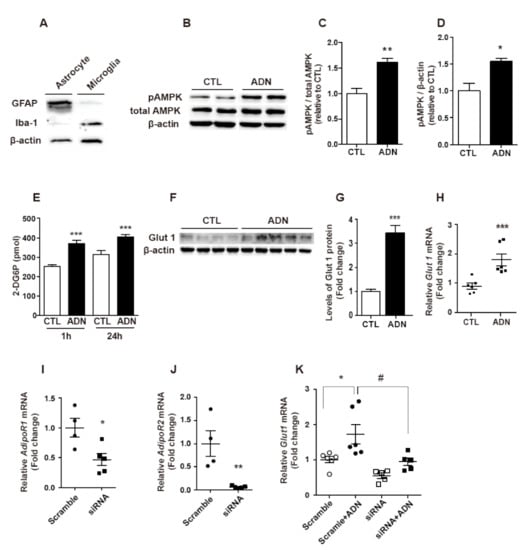 Adiponectin enhances glucose uptake in primary astrocytes. The primary astrocytes and microglia were set up at 5 × 105 cell/well and subjected to western blot analysis by using antibodies for GFAP and Iba-1 proteins. (A) GFAP protein was predominantly present in primary astrocytes but Iba-1 protein was almost absent in primary microglia. (B–K) Primary astrocytes were seeded at 5 × 105 cell/well, starved overnight, and treated with adiponectin (ADN, 1 μg/mL) for 24 h. Cell lysates were subjected to western blot analysis using antibodies against (B–D) pAMPK, total AMPK, β-actin and (F,G) glucose transporter-1 (GLUT-1) proteins and qRT-PCR using a primer set of (H,K) Glut-1 gene. Exogenous treatment of adiponectin led to increased levels of (F,G) Glut-1 protein and (H) Glut-1 mRNA in primary astrocytes. (E) Adiponectin treatment enhanced glucose uptake in cultured primary astrocytes as determined by 2DG-glucose uptake assay. AdipoR1 and AdipoR2-specific siRNA were transfected into the primary astrocytes to confirm the mRNA expression of Glut1 induced by adiponectin treatment. qPCR data showed a significant decrease in (I) AdipoR1 and (J) AdipoR2 mRNAs. Elevated (K) Glut1 mRNA induced by adiponectin was effectively rescued by transfection of AdipoR1 and AdipoR2-specific siRNAs. Results are presented as the means ± SEM. n= 4 for (B–D); n= 3 for (E); n= 4–5 for (F,G); n= 6 for (H); n= 4–5 for (I,J); n= 5–6 for (K). All experiments were performed from at least three different preparations of astrocytes. * p < 0.05; ** p < 0.01; *** p < 0.001; # p < 0.05.