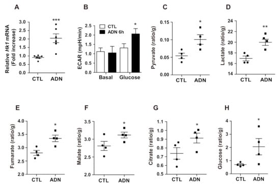 Adiponectin enhances glycolytic activity in primary astrocytes. Primary astrocytes were seeded at 5 × 105 cell/well, starved overnight, and treated with adiponectin (ADN, 1 μg/mL) for 24 h. (A) The level of mRNA encoding hexokinase 1 (Hk1) was upregulated in adiponectin-treated primary astrocytes compared to that in vehicle-treated primary astrocytes as determined by qRT-PCR (n = 6 for each group). (B) The extracellular acidification rates (ECAR) were elevated by adiponectin treatment (n = 3 for each group). GC-MS results showed increased levels of (C) pyruvate, (D) lactate, (E) fumarate, (F) malate, (G) citrate, and (H) glucose in the hypothalamus of adiponectin-treated mice compared with that of vehicle-treated mice (n = 4 for each group). Results are presented as the means ± SEM. qPCR and ECAR experiments were performed from at least three different preparations of astrocytes. * p < 0.05; ** p < 0.01; *** p < 0.001.