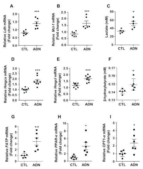 As the production and release of monocarboxylates from astrocytes are coupled to glycolytic processes [,], we next interrogated whether adiponectin alters production of monocarboxylates by performing the analysis of mRNA expression in primary astrocytes treated with recombinant adiponectin. We observed that adiponectin treatment led to increased mRNA level of lactate dehydrogenase (Ldh), a catalytic enzyme that reversibly induces conversion of lactate to pyruvate (Figure 4A), and upregulated monocarboxylate transporter-1 (Mct-1) (Figure 4B). In support of these molecular observations, an exogenous treatment of recombinant adiponectin led to an elevation of lactate release in cultured primary astrocytes (Figure 4C). In addition, adiponectin-treated astrocytes showed increased mRNA levels of genes involved in the biosynthesis of ketone bodies including hydroxymethylglutaryl-CoA synthase (Hmgcs) (Figure 4D) and hydroxymethylglutaryl-CoA lyase (Hmgcl) (Figure 4E). In accordance with the patterns of mRNA expression, the medium level of β-hydroxybutyrate was significantly elevated in adiponectin-treated primary astrocytes (Figure 4F). To confirm the increased synthesis and release of ketone bodies, we identified that adiponectin-treated astrocytes showed increased mRNA levels of fatty acid transport protein (FATP), a fatty acid transporter and genes involved in fatty acid oxidation, such as peroxisome proliferator-activated receptor-α (PPAR-α) and carnitine palmitoyltransferase 1-α (CTP1-α) (Figure 4G–I). These findings indicate that adiponectin promotes synthesis and release of monocarboxylates including lactate and β-hydroxybutyrate in the hypothalamic astrocyte through promoting glucose and lipid utilization.