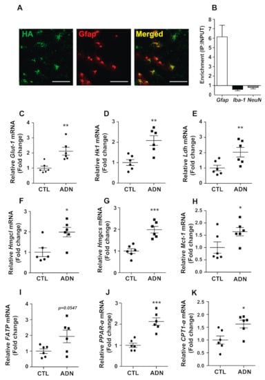 Central administration of adiponectin leads to enhanced glucose utilization and monocarboxylates production in hypothalamic astrocytes of the mice. Ribo-tag analysis were performed to determine alterations in astrocyte-specific mRNA expression in the hypothalamus of Gfap-CreERT2:Rpl22HA mice. (A) Representative images revealing co-expression of HA and Gfap immunosignals in the hypothalamus of Gfap-CreERT2:Rpl22HA mice. (B) qRT-PCR data showing enrichment of Gfap mRNA, a molecular marker for astrocyte (but not Iba-1, a molecular maker for microglia and NeuN, a molecular marker for neuron) in the purified RNA immunoprecipitated with HA antibody compared with the input RNA extracted from hypothalamus. Elevated mRNA levels of (C) Glut-1, (D) Hk1, (E) Ldh, (F) Hmgcl, (G) Hmgcs, (H) Mct-1, (I) FATP, (J) PPAR-α and (K) CTP1-α were observed in hypothalamic astrocytes from Gfap-CreERT2:Rpl22HA mice that received an icv injection of adiponectin (ADN, 3 μg/2 μL) compared with vehicle-treated control group (CTL). Results are presented as mean ± SEM. n = 6 for each group. * p < 0.05, ** p < 0.01, *** p < 0.001. Scale bar = 50 μm.
