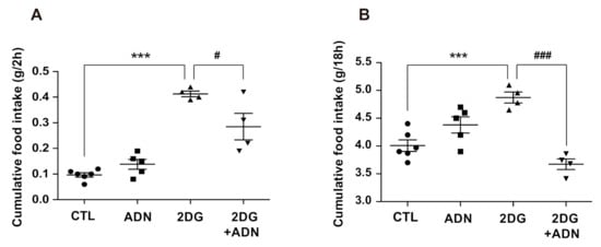 2.6. Adiponectin Rescued 2-DG-Induced Hyperphagia