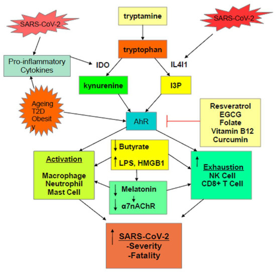 Although tryptophan is classically associated with being the necessary precursor for serotonin synthesis, the majority (95%) of the body’s tryptophan is converted to kynurenine by indoleamine 2,3-dioxygenase (IDO) and tryptophan 2,3-dioxygenase (TDO). An increase in pro-inflammatory cytokines, including IL-1β, IL-6, IL-18, and tumor necrosis factor (TNF), but especially IFNγ, increases IDO (and/or TDO in some cells) to further raise kynurenine levels and suppress serotonin, NAS, and melatonin levels [7]. TDO may also be increased by stress-associated cortisol and hypothalamus–pituitary–adrenal (HPA) axis activation [8]. As such, many medical conditions that are associated with an increase in pro-inflammatory cytokine or stress-induced dysregulation of the HPA axis will have increased IDO/kynurenine/AhR activation as an aspect of their pathophysiology, as evident in cancers [9], Alzheimer’s disease [10], depression [11], and arthritis [12], as well as in many other medical conditions. Consequently, the ‘cytokine storm’ that occurs to many viral infections, including influenza and SARS-CoV-2, will be associated with the induction of IDO/TDO/kynurenine/AhR activation and therefore wills alterations in the immune response and decreases in the serotonergic and melatonergic pathway. This is supported by data showing circulating kynurenine to be significantly increased in SARS-CoV-2 infection, in correlation with levels of severity [13].