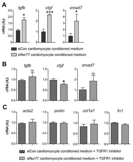 2.5. Nur77-Silenced Cardiomyocytes Promote a MyoFB Phenotype via TGF-β
