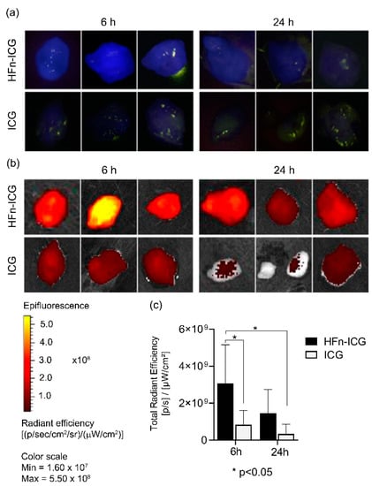 To confirm and obtain a quantitative analysis of these observations, we coupled the imaging from the KARL STORZ NIR/ICG endoscopic system to the imaging performed by the IVIS Lumina II system, which allowed us also to quantify the fluorescence due to the software for analysis. The IVIS lumina II acquisitions corroborated that the HFn-ICG tumor accumulation at 6 h was still visible at 24 h, while the free ICG did not accumulate and was rapidly cleared (Figure 1b,c). Indeed, there was a significant difference in the levels of fluorescence between HFn-ICG and free ICG at 6 h as well as with ICG at 24 h. Therefore, in mice injected with HFn-ICG it was possible to detect a higher fluorescence signal compared to the signal visible at 6 h for free ICG.