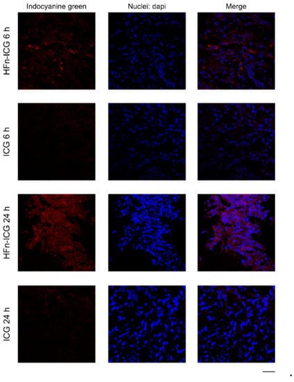 Confocal images of tumor cryosections collected from mice injected with HFn−ICG or free ICG (red) and sacrificed at 6 and 24 h. Nuclei were stained with 4’,6-Diamidino-2-phenylindole dihydrochloride (dapi; blue). Scale bar = 50 μm.