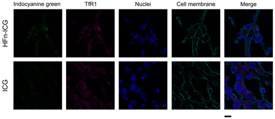 Colocalization between the transferrin receptor-1 (TfR1) receptor and ICG upon HFn-mediated internalization. Tumors collected from mice injected with HFn−ICG or free ICG (green) and sacrificed at 6 h, were cryosectioned and labelled to study the colocalization with TfR1 (purple). Nuclei and cell membranes were stained with dapi (blue) and Wheat Germ Agglutinin-Alexa Fluor 488 (cyan), respectively. Scale bar = 10 μm.
