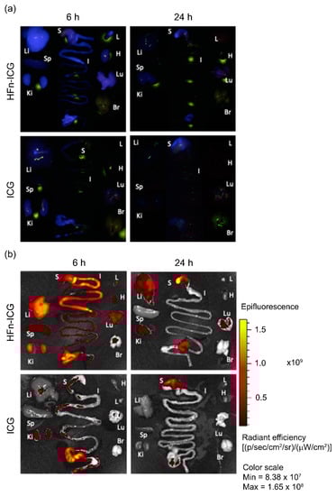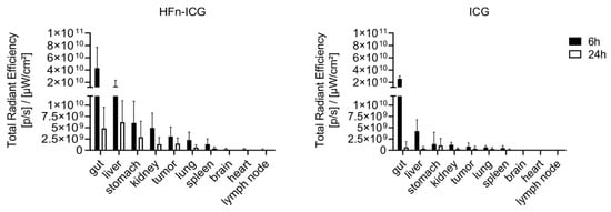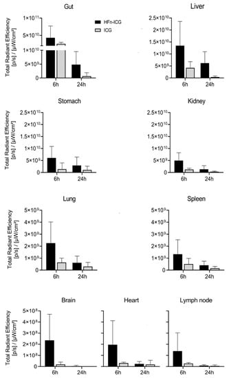 Presumably, ICG, which has a quicker clearance, accumulated in the liver at an earlier time and, at 6 h, was already completely excreted into the bile (Figure 6). The fluorescence intensity registered in the stomach had a similar trend to that in the kidney in both groups. The fluorescence signal appeared attenuated at 24 h for HFn-ICG, while it was visible at lower levels for ICG even at 6 h. With regard to the lungs, spleen, brain, heart, and axillary lymph nodes, the signal was far lower, with an order of magnitude of 108–109, compared to the fluorescence at the gut, liver, stomach, and kidney (1010–1011).
