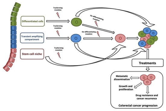 ISCs and transit-amplifying cells are the best candidates for the origin of CCSCs, given that their high proliferative capacity allows easy acquisition of genetic and epigenetic aberrations. Although, studies on histology of intestine and CRC suggested that CCCSs might arise from terminally differentiated cells []. Recent studies on de-differentiation process suggested that intestinal non-stem cell mutated and persevered could lead to adenoma progression in the presence of additional genomic events (e.g., b-catenin mutation combined with increased NFKB signaling or changes in the microenvironment) []. ISC features could be sustained by genetic/epigenetic aberrations acquired into different neoplastic subclones []. Stemness is responsible for three key processes that trigger tumor progression: Cell growth and proliferation, recurrence and metastasization, and therapy resistance (Figure 1).