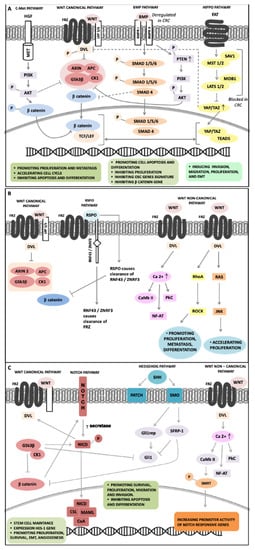 Overview of feedback loops between signaling pathways involved in CRC pathogenesis and controlling stem cell behavior through regulation of β-catenin, a key downstream convergent component. (A) c-MET activation induces AKT and GSK3β phosphorylation leading to LRP5/6 phosphorylation and β-catenin stabilization; deregulation of BMP signaling stabilizes β-catenin by downregulation of SMAD4 and PTEN phosphorylation; Hippo signaling repression stabilizes β-catenin reducing the TAZ-DVL complex in the cytoplasm, while the increasing of TAZ/YAP complex in the nucleus cooperates with β-catenin. (B) RSPOs induce RNF43/ZNRF3 ubiquitination improving WNT canonical and non-canonical signaling. (C) The interactions between Notch and WNT signaling improve Notch activity, GSK3β phosphorylates NICD-1 favoring localization in the nucleus, CaMKII induces phosphorylation of SMRT increasing promoter activity of Notch-responsive genes; the crosstalk between Hedgehog and WNT signaling includes Gli-3 phosphorylation by GSK3β/CK1 blocking Gli-1 activity, SFRP-1 interacts with Gli-1 and β-catenin to control their nuclear–cytoplasmic distributions.