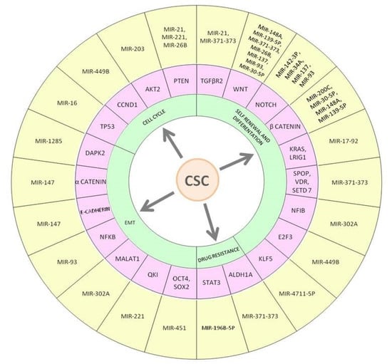 Strong and complex regulatory networks have been identified between dysregulated miRNAs and disruption of the cell signaling balance involved in CSCs survival and proliferation. An increasing number of studies have established that miRNAs, acting as tumor suppressor or oncogene, could moderate and/or deregulate various signaling pathways involved in regulatory mechanisms of CSCs as well as cell cycle, self-renewal, and differentiation, EMT and drug resistance (Figure 3).