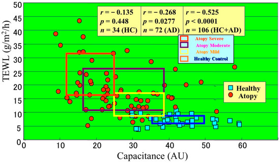 Relationship between TEWL and capacitance values in association with the severity of AD [4].