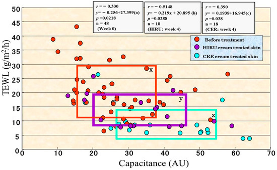 Comparison between TEWL and capacitance values during 4 weeks of treatment with pCER or HIRU creams in association with disease severity [32]. x: severe, y: mild, z: healthy control in disease severity.