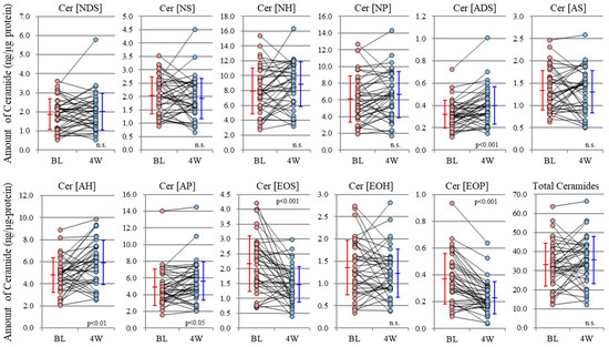 Changes in the class ratio (ng/μg protein) of endogenous ceramides in the SC of nonlesional AD skin after 4 weeks of using the pCer lotion (N = 39) [12].